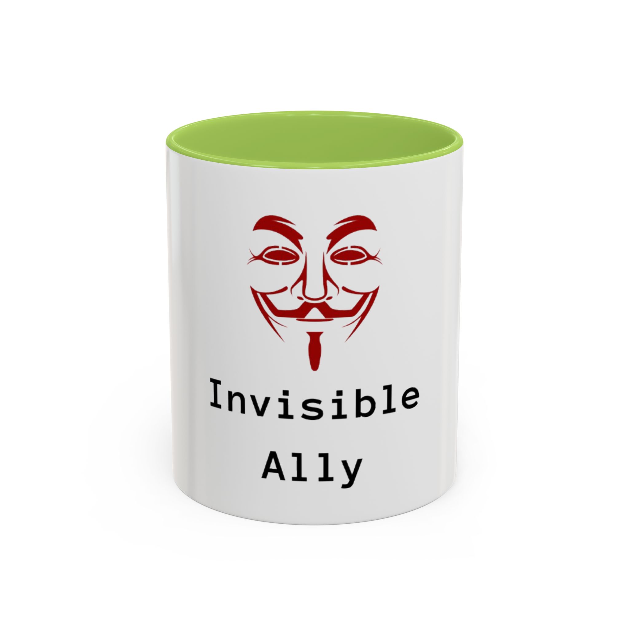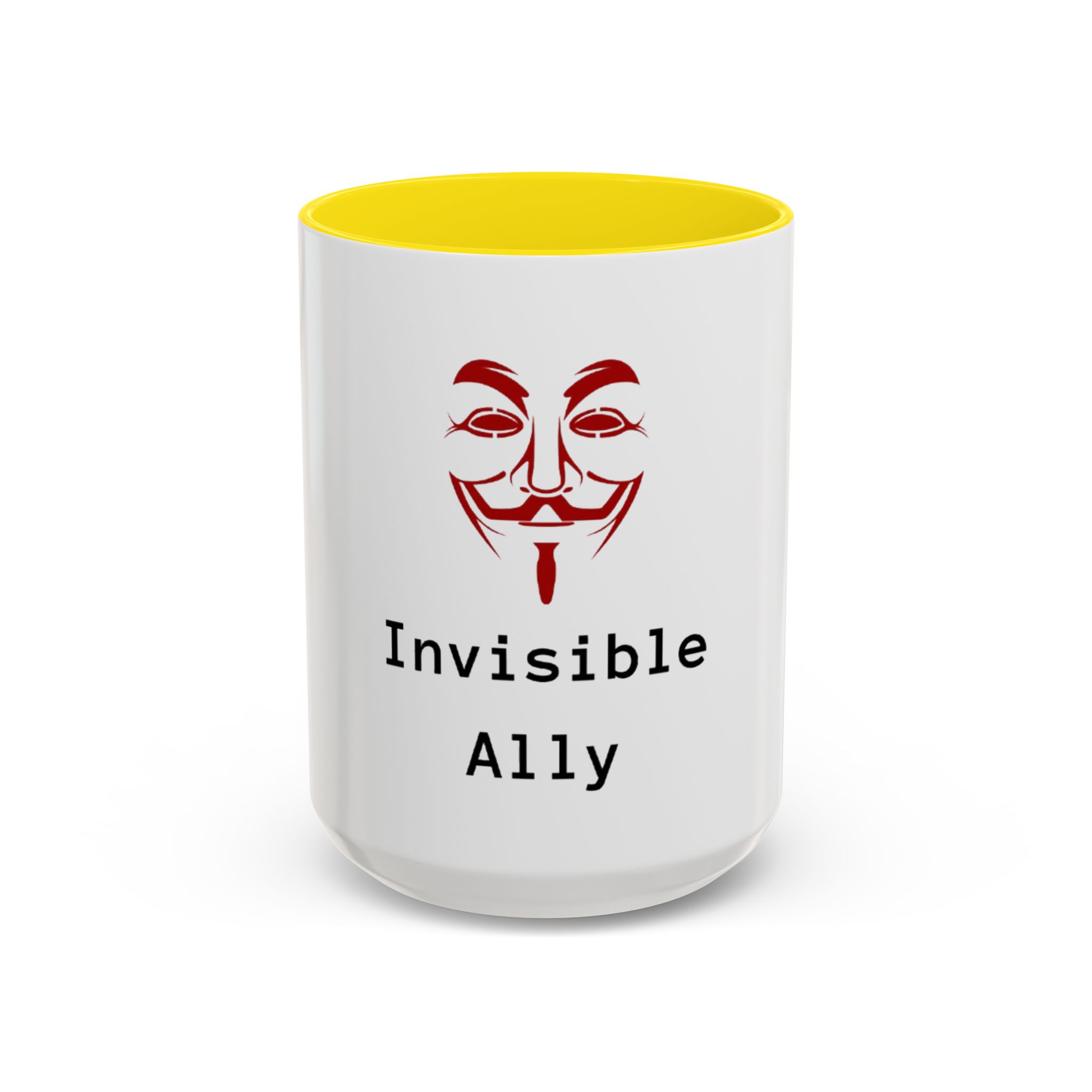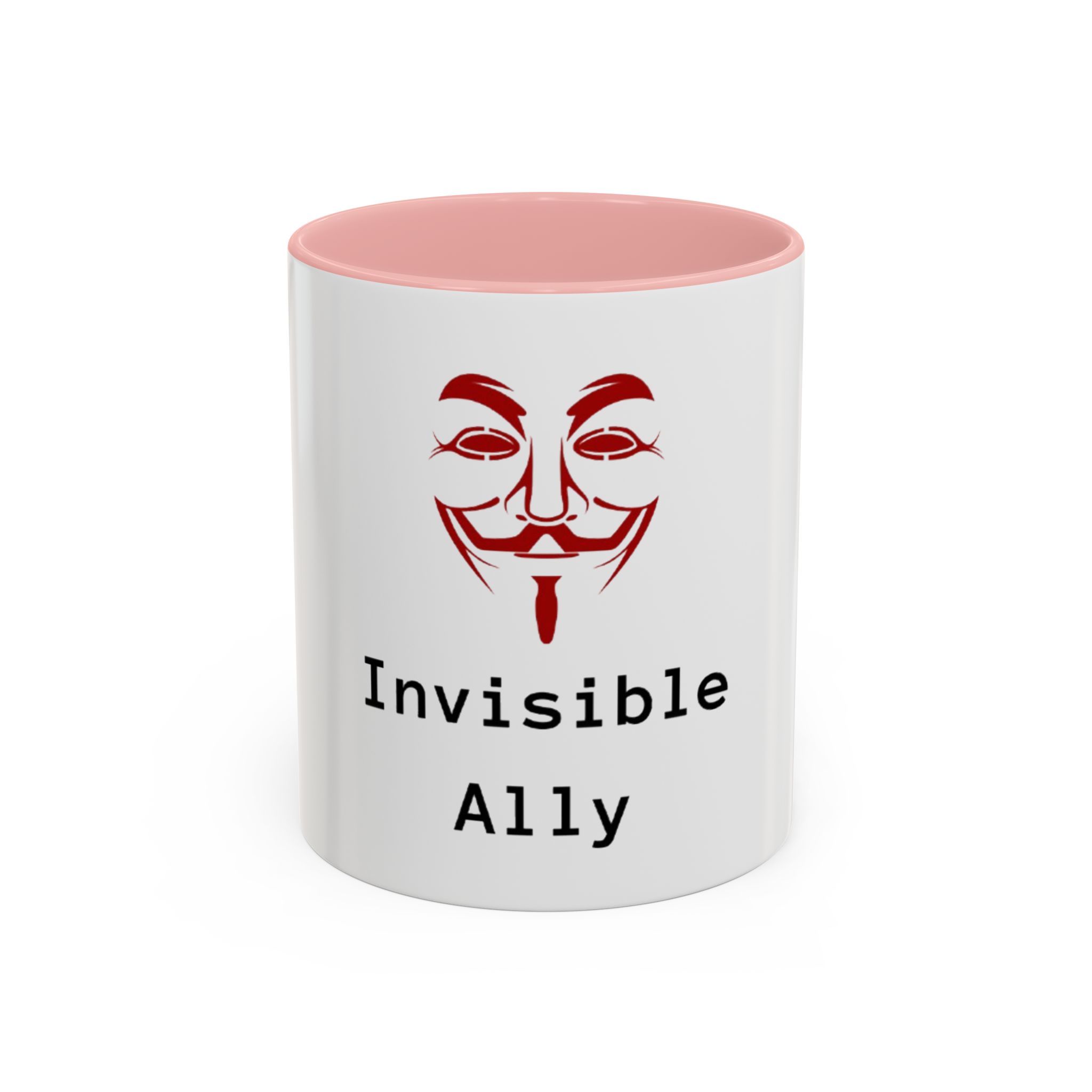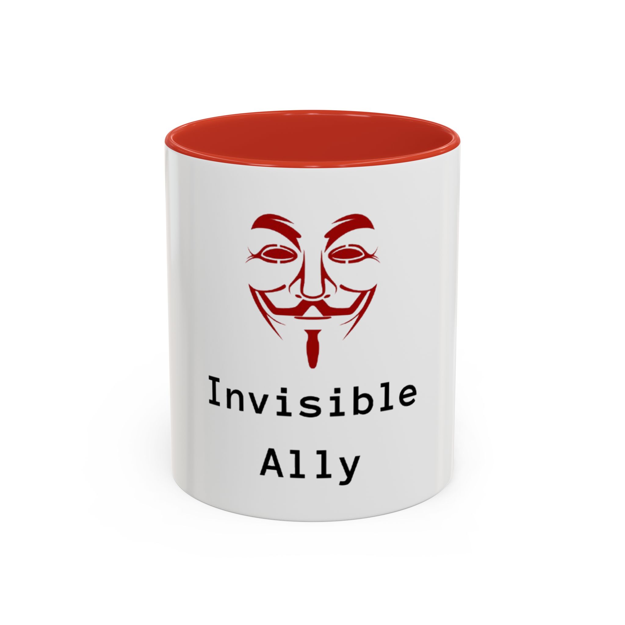 Sip quietly, stand firmly. This ceramic mug pairs a bold, slightly mysterious graphic with the understated statement “Invisible Ally.” Its high-contrast colored interior and handle frame the clean white exterior, letting the red masked emblem and typewriter-style text take center stage. It feels like a small, steady nod to solidarity—something you keep on your desk, reach for during late-night work, or set down beside meeting notes when you want to show support without fanfare. Durable, glossy, and easy to care for, it fits naturally into the routines of someone who prefers action over announcements.