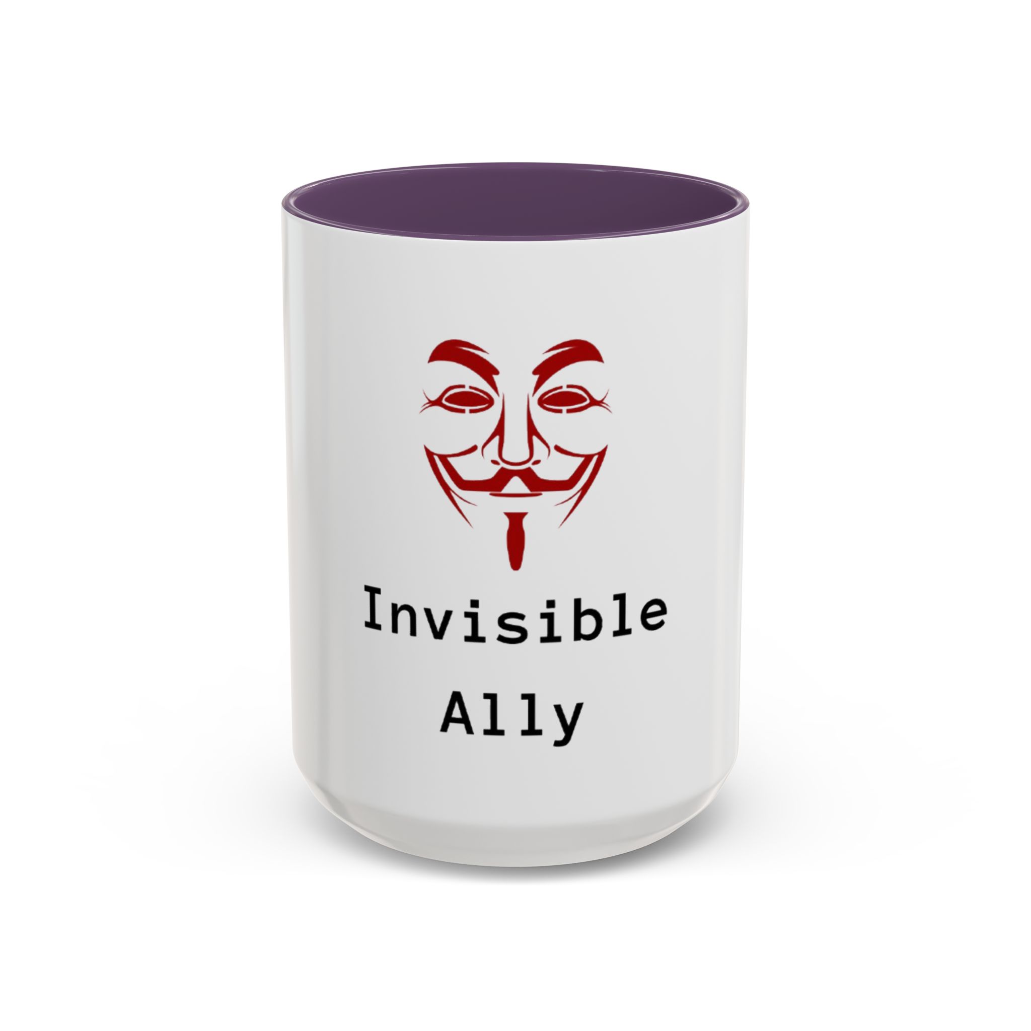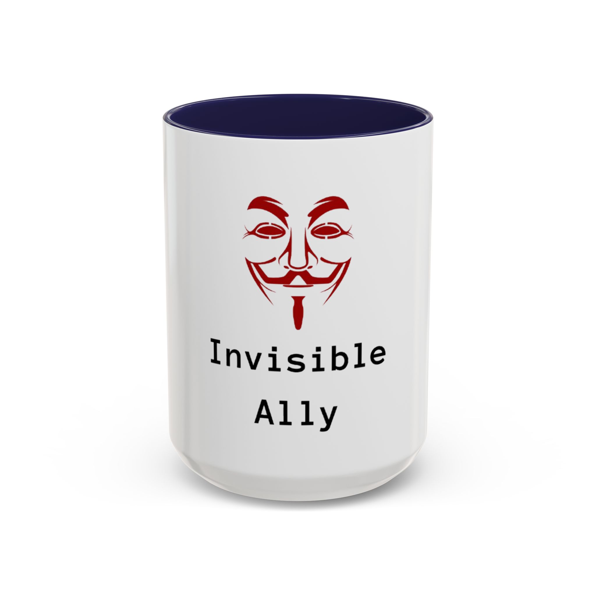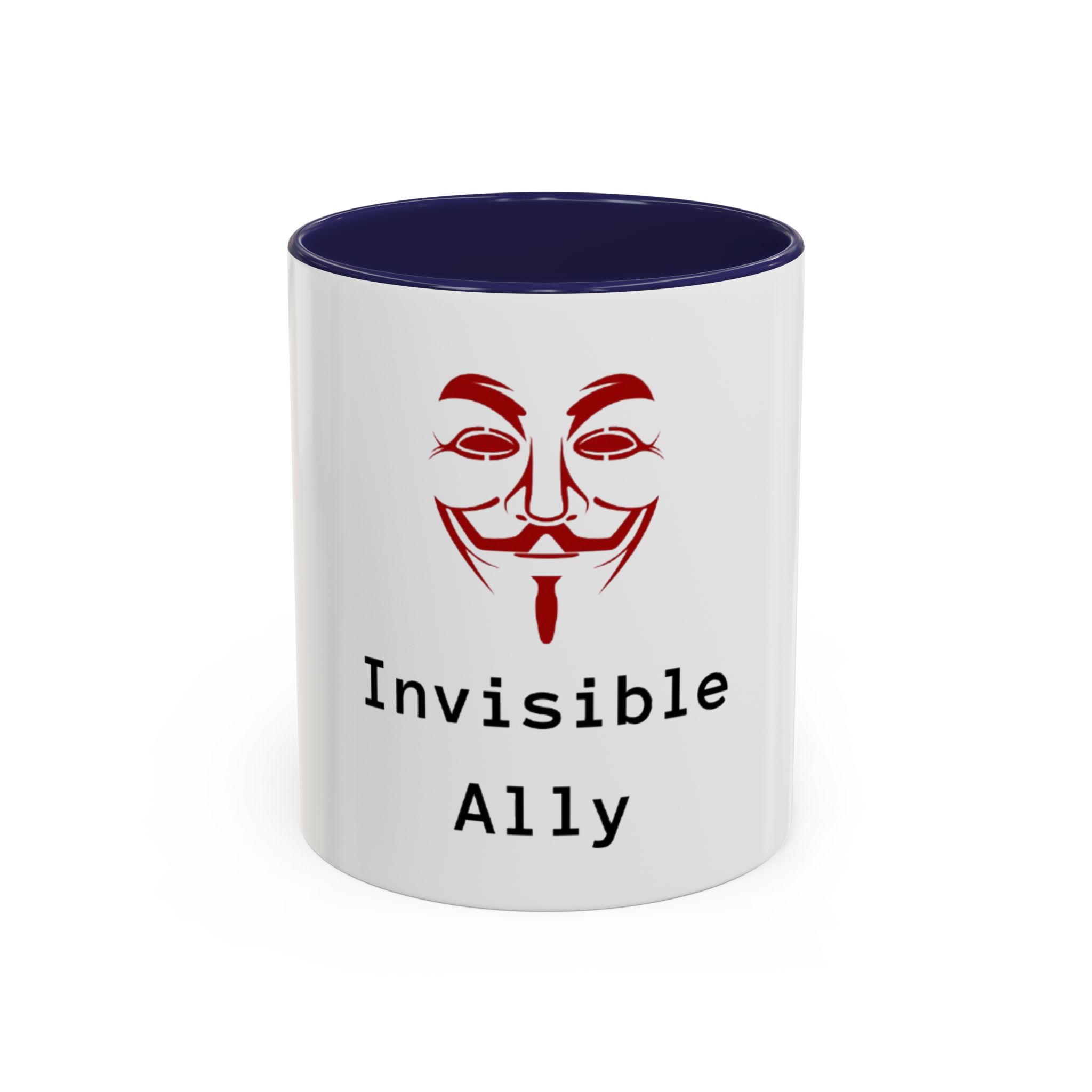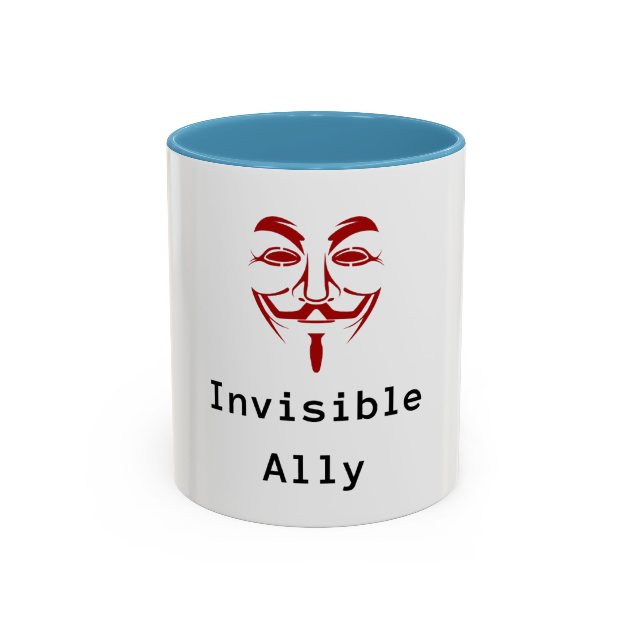 Sip quietly, stand firmly. This ceramic mug pairs a bold, slightly mysterious graphic with the understated statement “Invisible Ally.” Its high-contrast colored interior and handle frame the clean white exterior, letting the red masked emblem and typewriter-style text take center stage. It feels like a small, steady nod to solidarity—something you keep on your desk, reach for during late-night work, or set down beside meeting notes when you want to show support without fanfare. Durable, glossy, and easy to care for, it fits naturally into the routines of someone who prefers action over announcements.