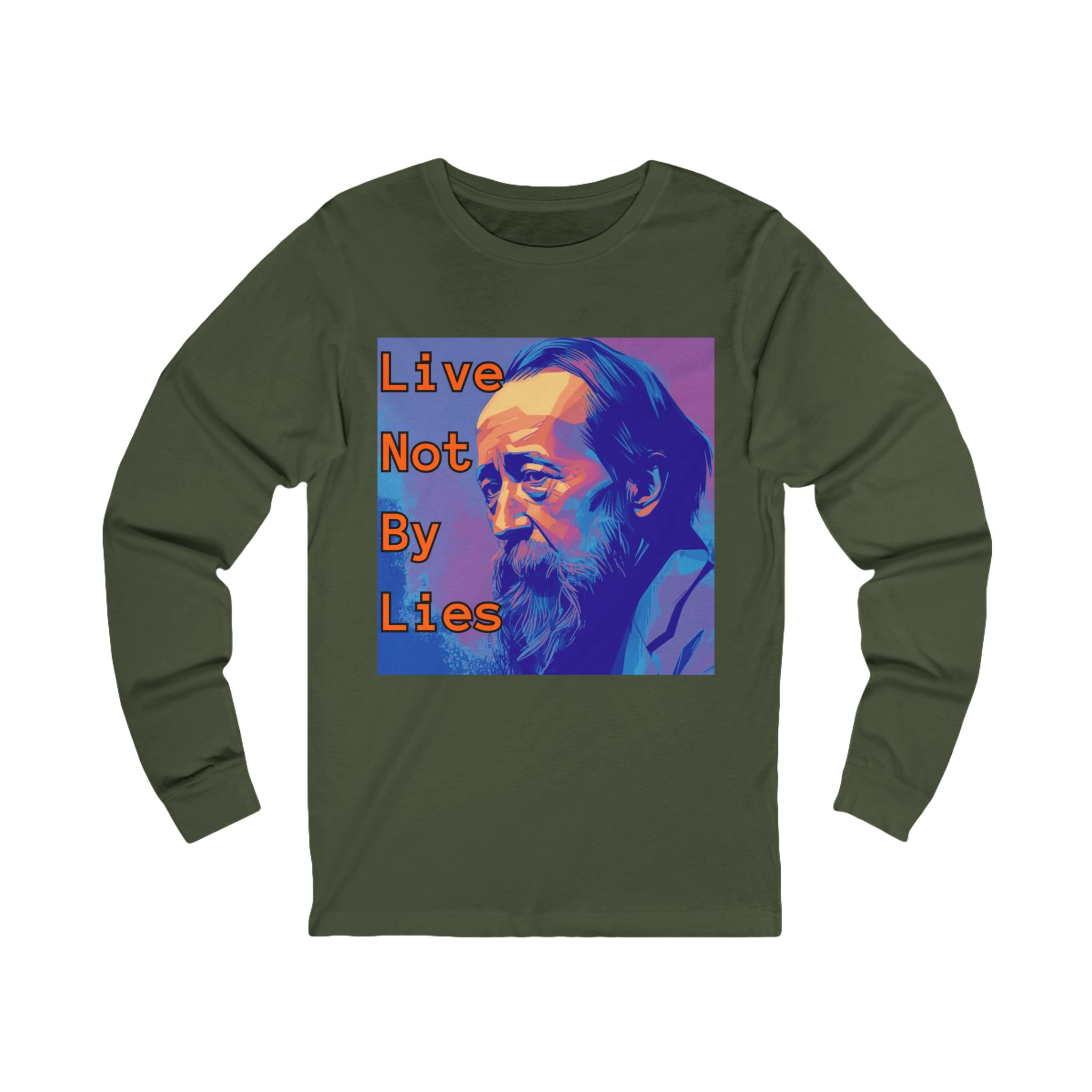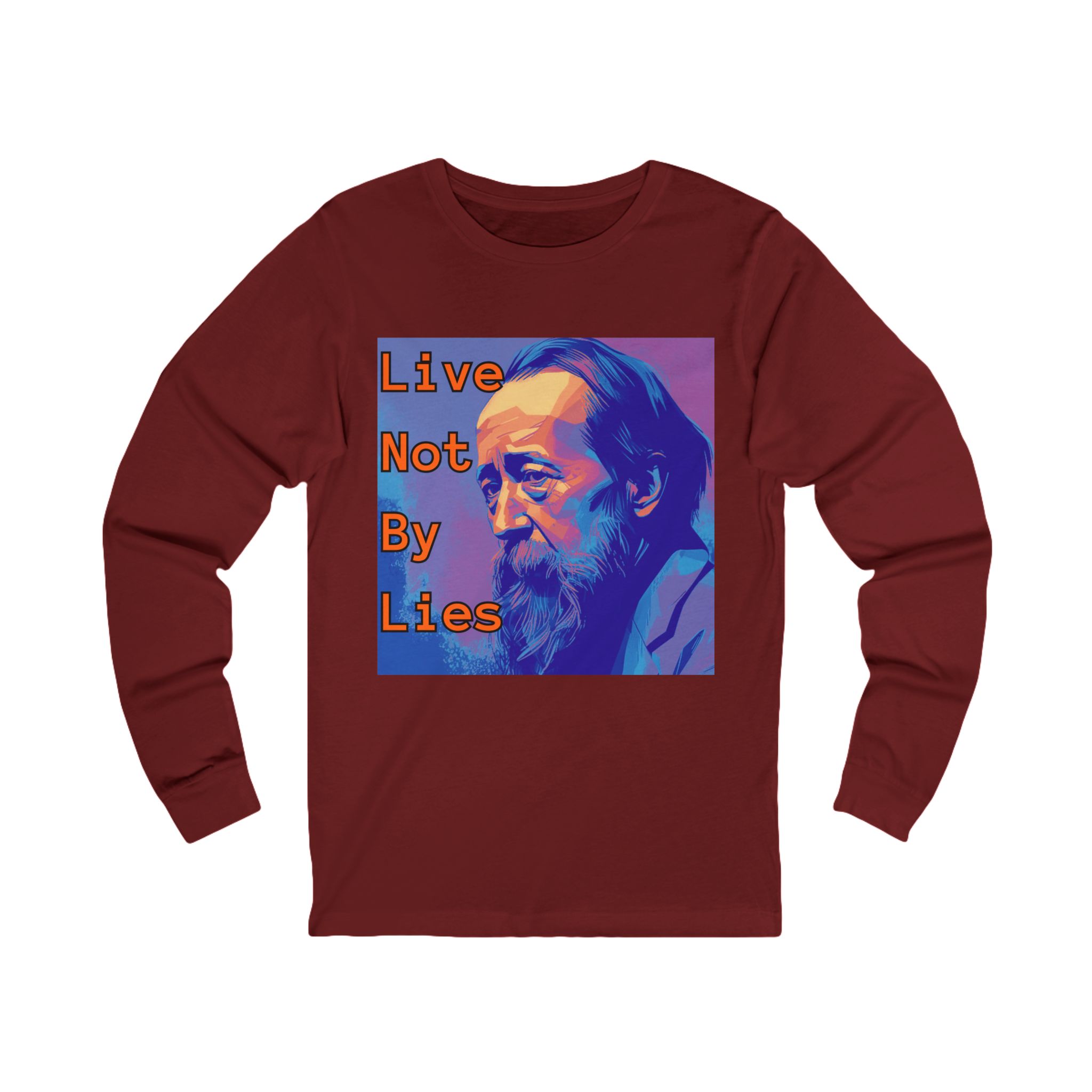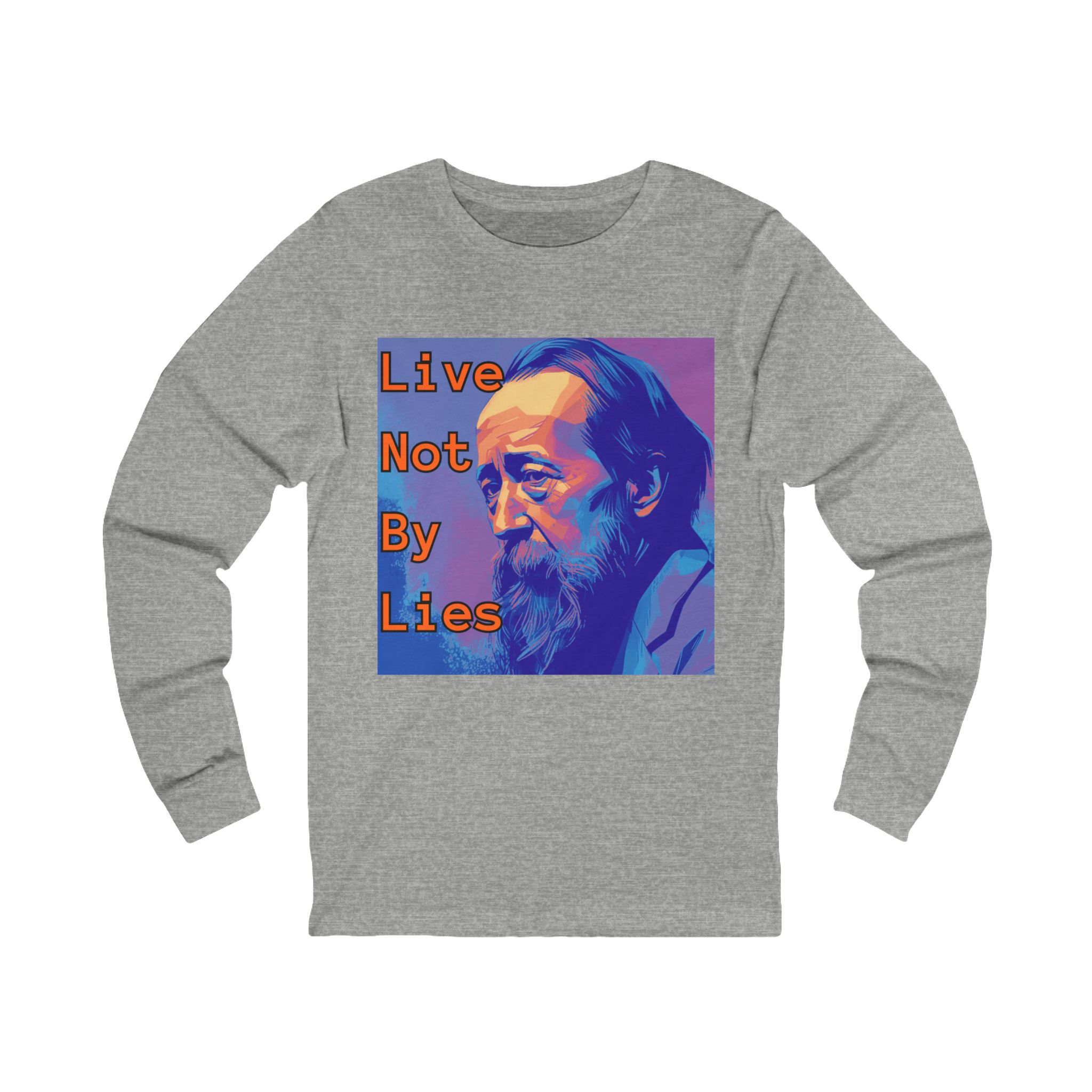 This long-sleeve tee carries quiet conviction. A vivid pop-art portrait sits center chest, overlaid with the phrase “Live Not By Lies” — a line that reads like a private pledge. The lightweight, soft cotton feels easy against skin and the retail fit keeps the silhouette neat under a jacket or alone. Wear it on crisp mornings to walk the neighborhood, to a campus discussion, or to a small-group meeting where ideas matter. The shirt settles into everyday life: steady, thoughtful, and straightforward — a subtle way to state what you stand for without shouting.