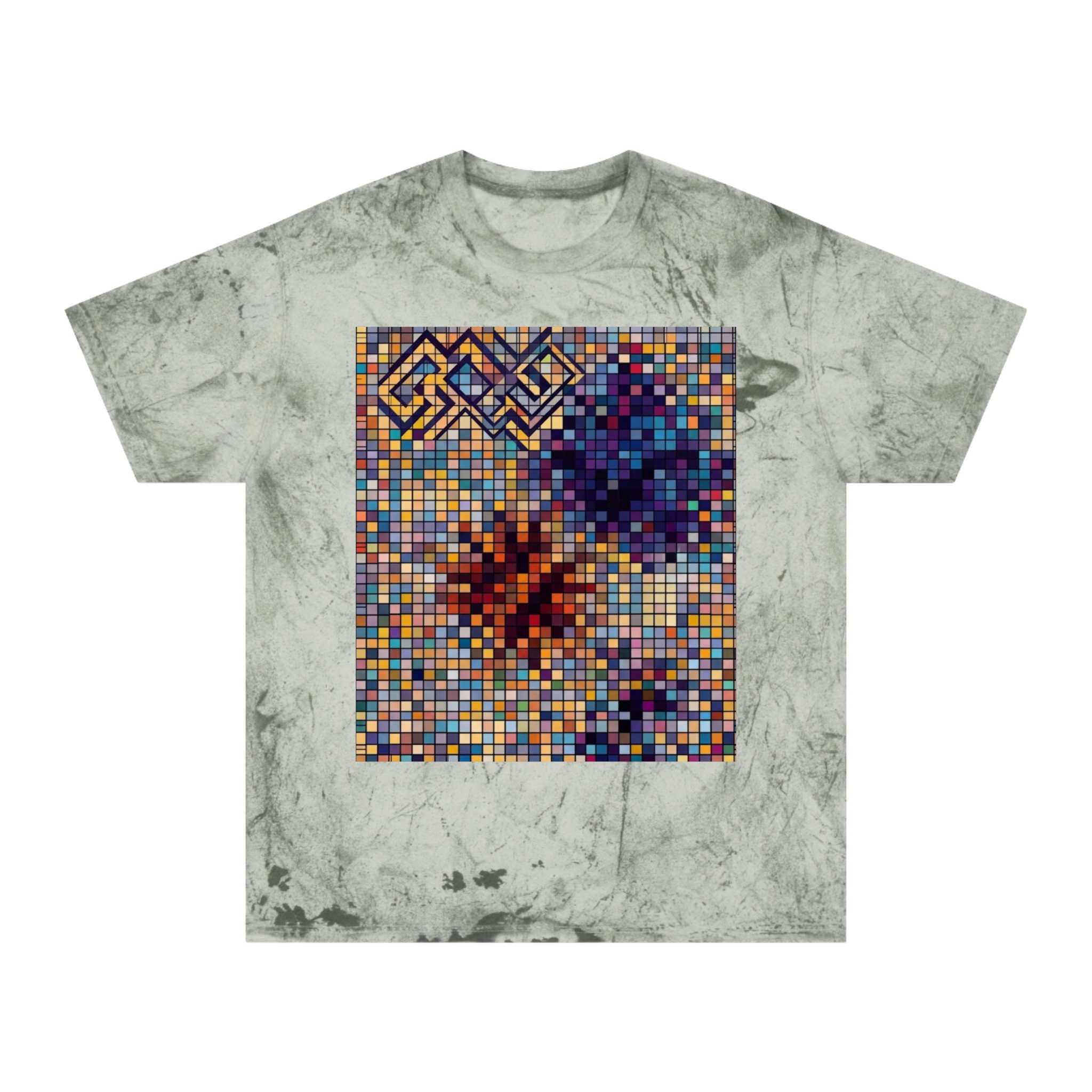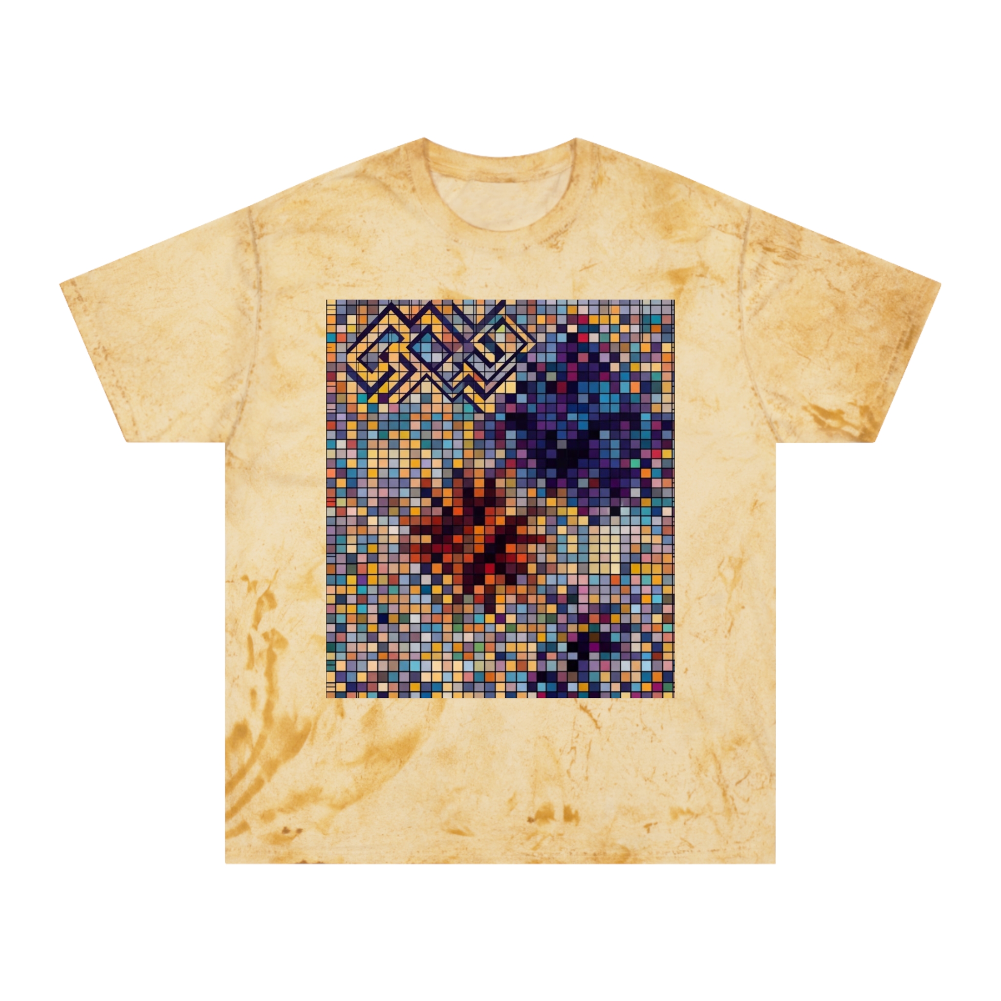 This relaxed, garment-dyed tee brings an artsy, vintage vibe to everyday wear. The Color Blast base creates a warm, variegated wash that looks hand-treated — each shirt carries its own subtle irregularities and depth. Centered on the chest is a pixel-style mosaic in jewel tones: clustered blues, purples, ochres and rusts form floral-like bursts and geometric corner detail that read like a cross between a retro video-game tile and a stained-glass panel. Wear it with worn denim or layered under an open flannel for looks that feel curated, lived-in, and quietly expressive. The fit drapes comfortably for casual days, studio sessions, gallery visits, or slow weekend coffee runs.