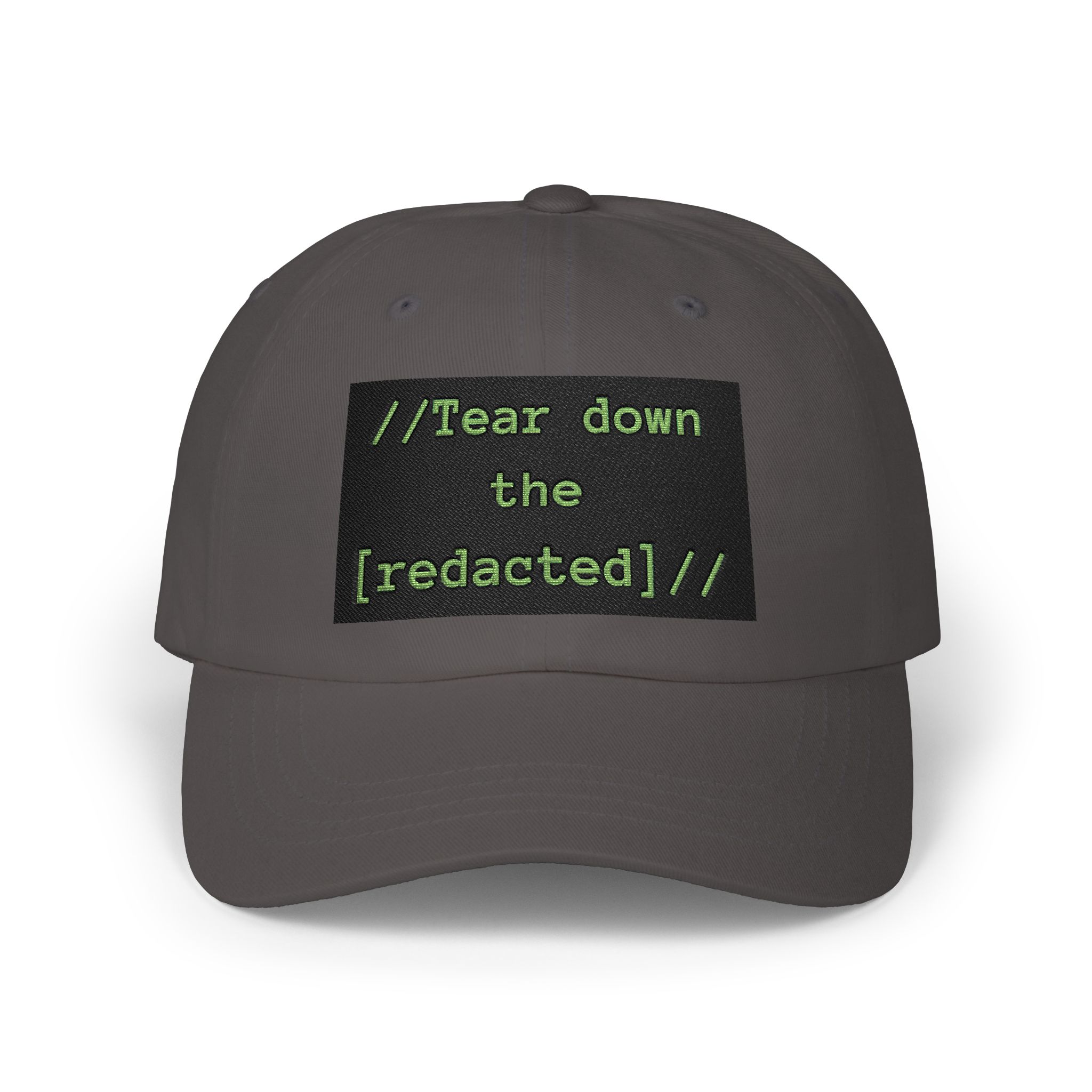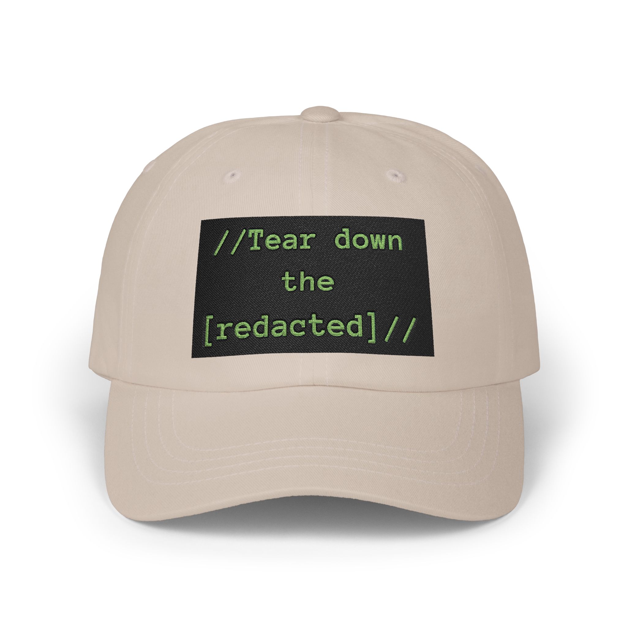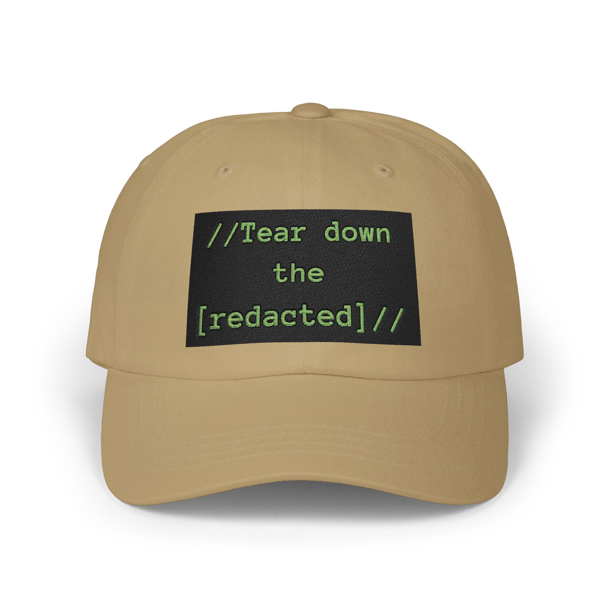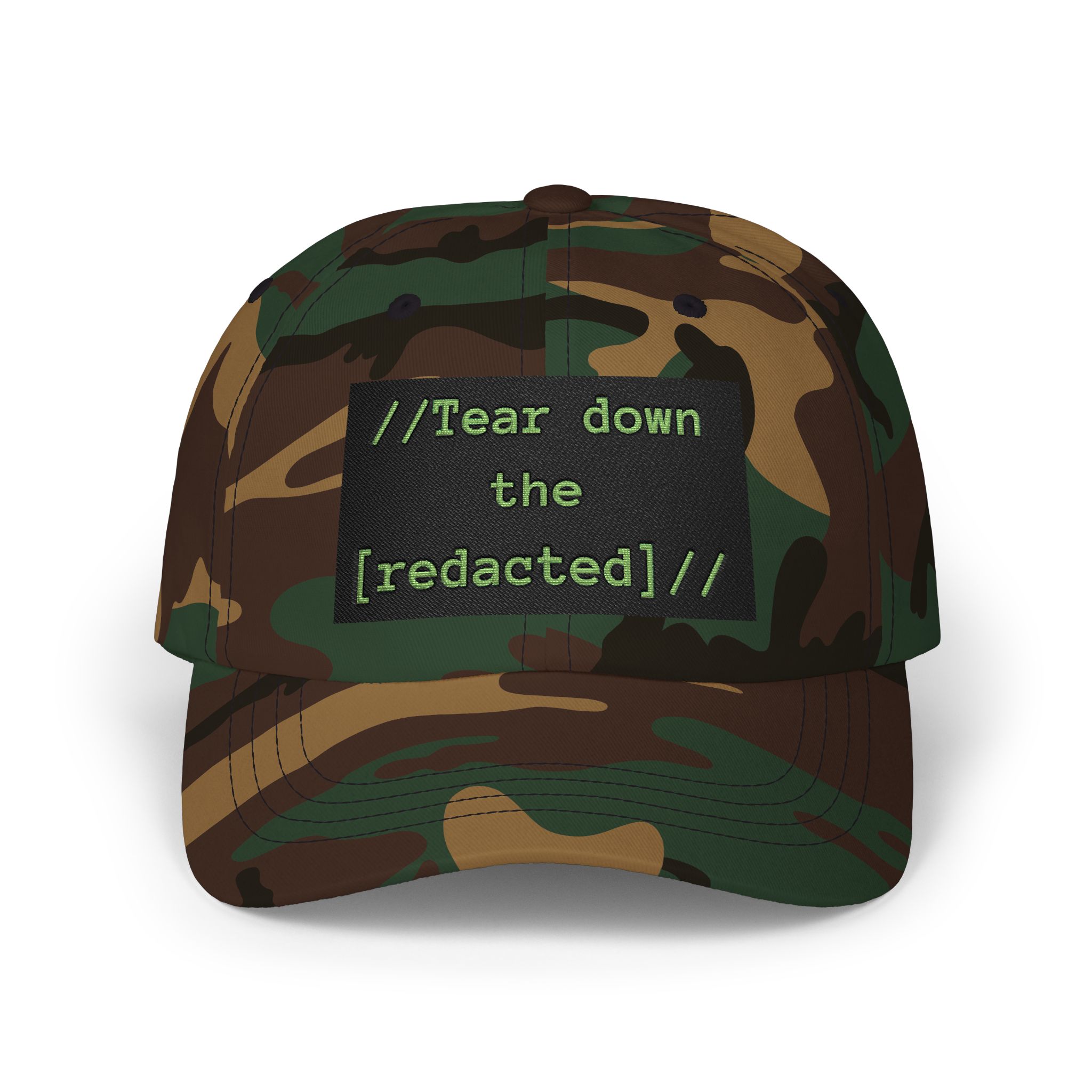 This low-profile dad cap carries a quiet, pointed message. Soft, unstructured cotton (or camo blend) shapes the hat for an easy, worn-in feel. On the front a stitched black patch reads “//Tear down the [redacted]//” in neon green, a subtle nod to disruption and inside jokes among activist-minded or internet-culture crowds. The pre-curved Permacurv® visor and matching underbill keep the silhouette clean. An adjustable self-fabric strap with antique brass buckle lets you find a tailored fit while a sewn-in label and brand sticker on the visor finish the look.
