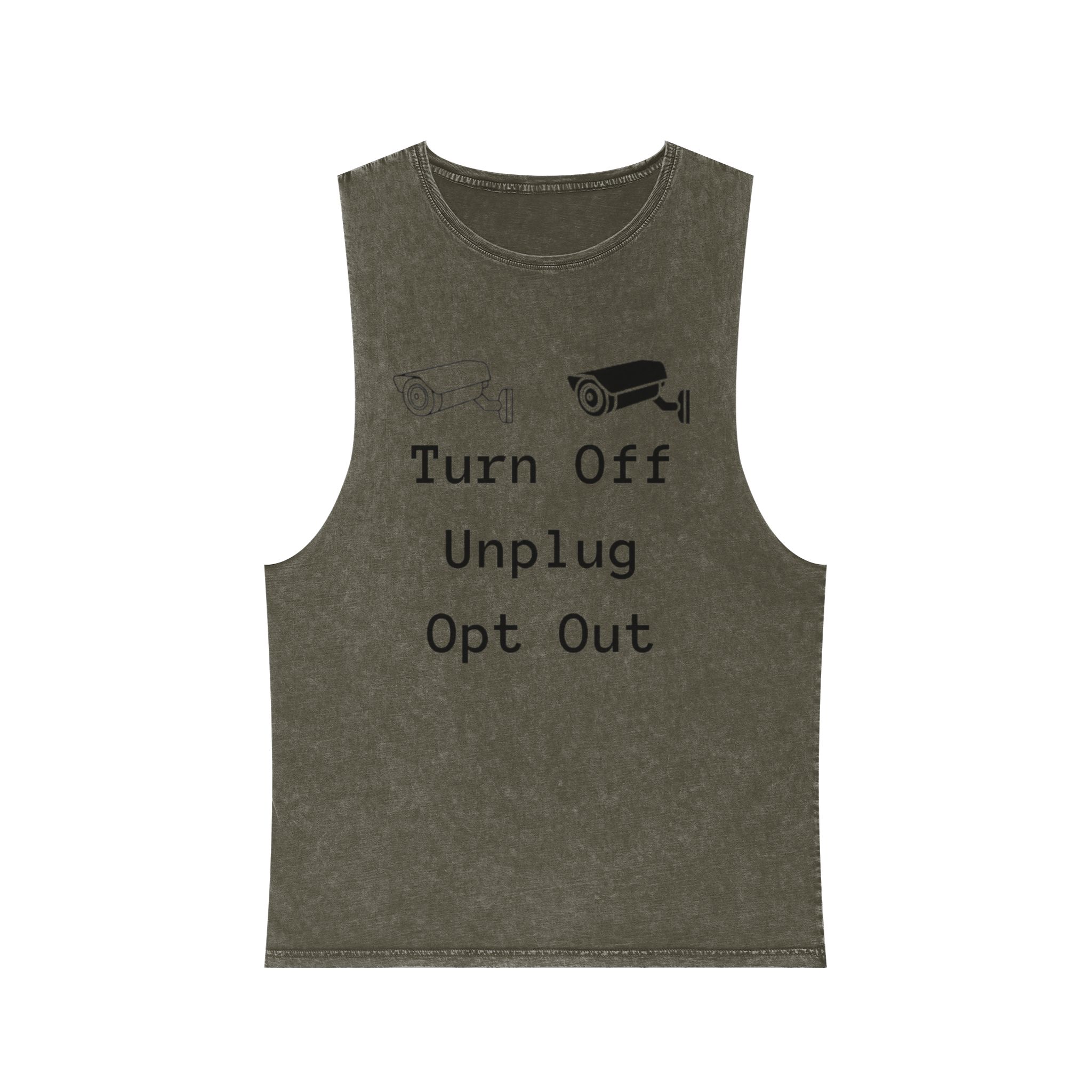 An effortlessly worn-in tank that speaks for those who choose presence over noise. This stonewash cotton tank has a lived-in softness and a raw-edge silhouette that invites movement and easy summer layering. The faded, muted print — a tiny camera icon above the words “Turn Off / Unplug / Opt Out” — reads like a calm reminder: step away from screens, breathe, and be here. It hangs casually on the body with a regular fit and low-cut armholes, pairing naturally with denim shorts, linen pants, or a favorite cardigan for a night around a bonfire or a slow Saturday at a cabin.
