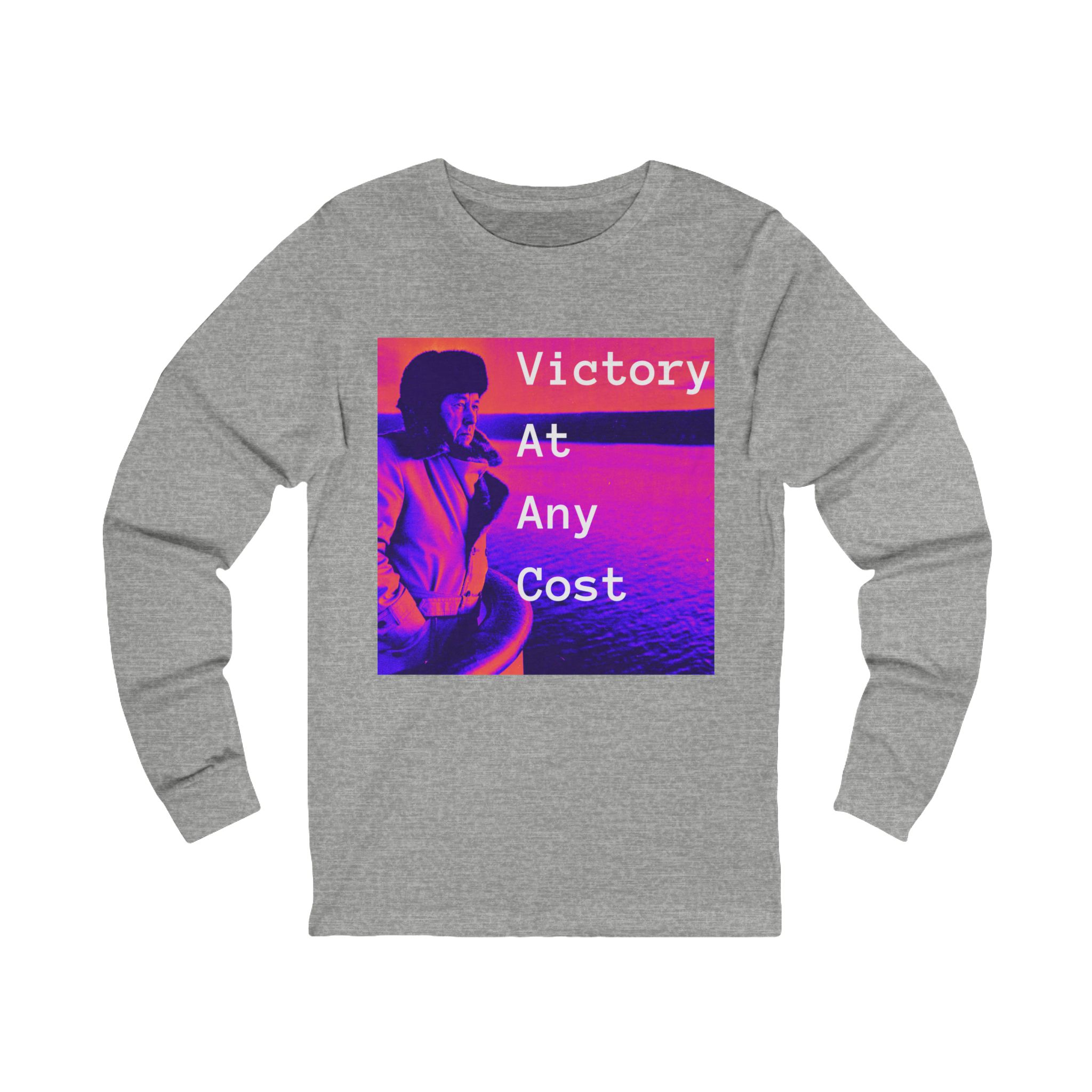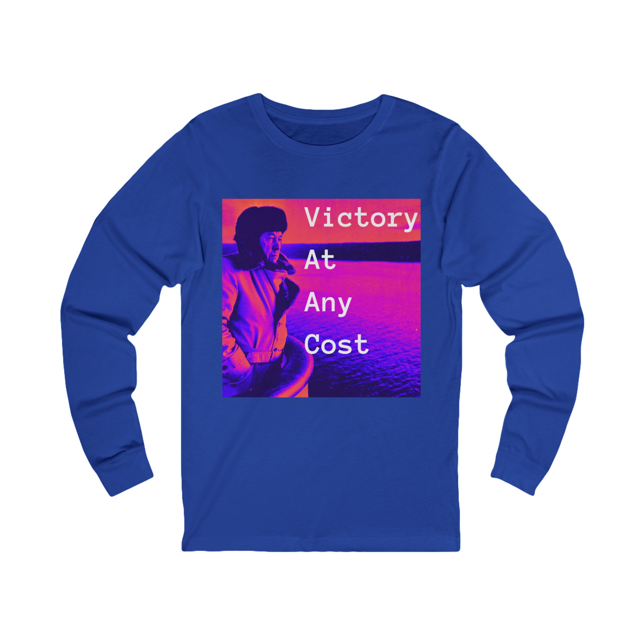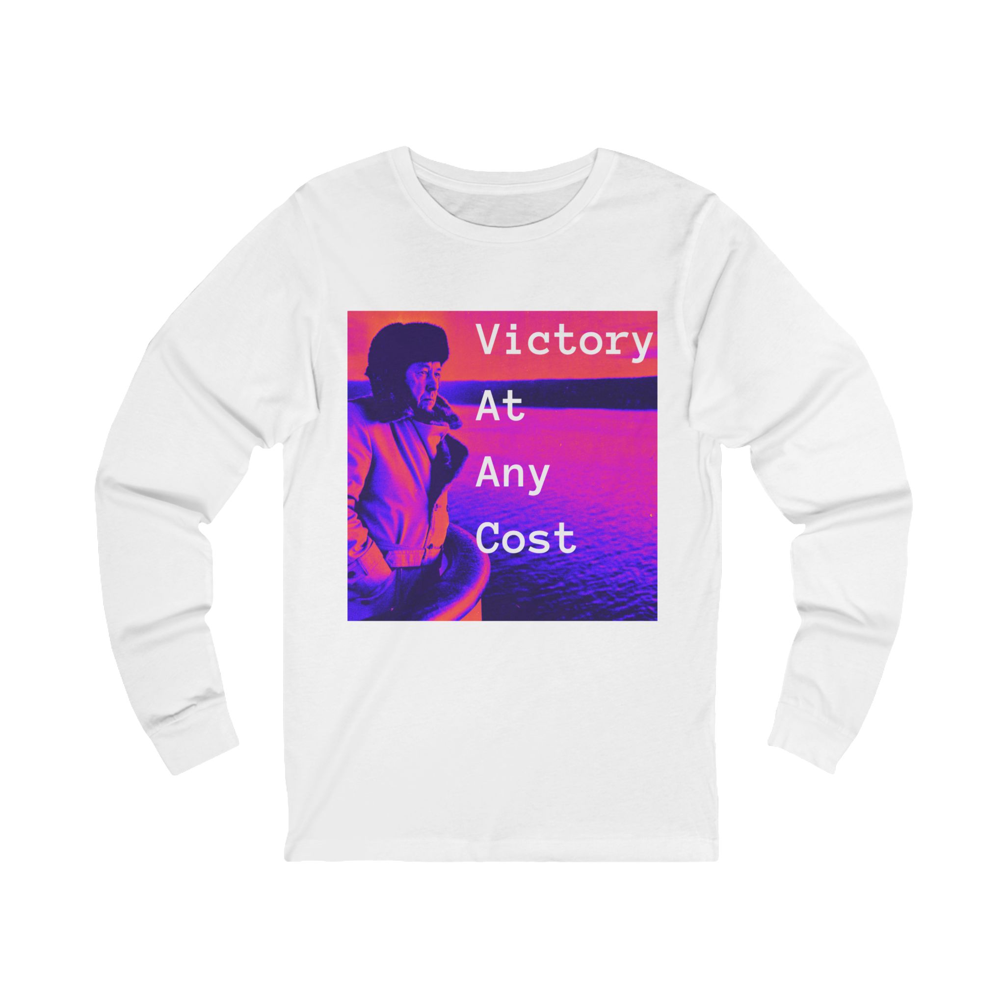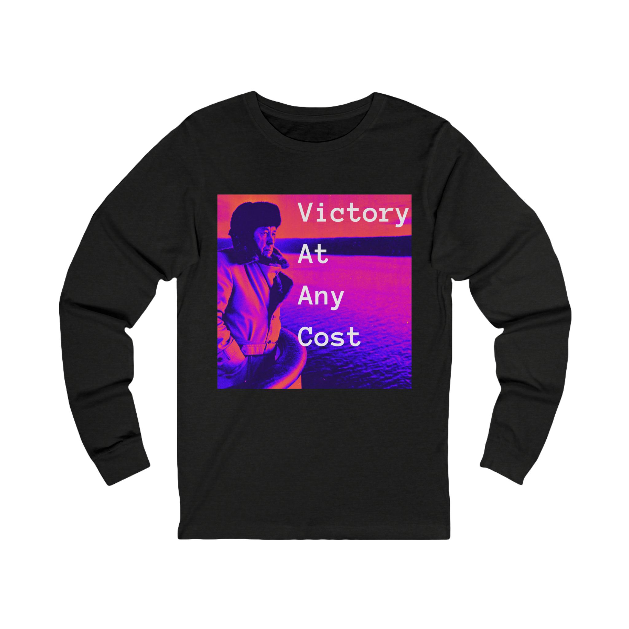 A lightweight long-sleeve tee with bold, retro-inspired artwork that reads “Victory At Any Cost.” The design uses high-contrast magenta and deep blue tones over a nostalgic photographic scene, giving it a moody, late-night vibe. Wear it layered under a denim jacket or alone on cool evenings — it brings a confident, rebellious edge without feeling heavy. The retail fit and soft Airlume cotton make it comfortable for all-day wear, while the tear-away label and printed inner neck keep the silhouette clean. This shirt moves easily from streetwear moments to late-night hangs and creative meetups.