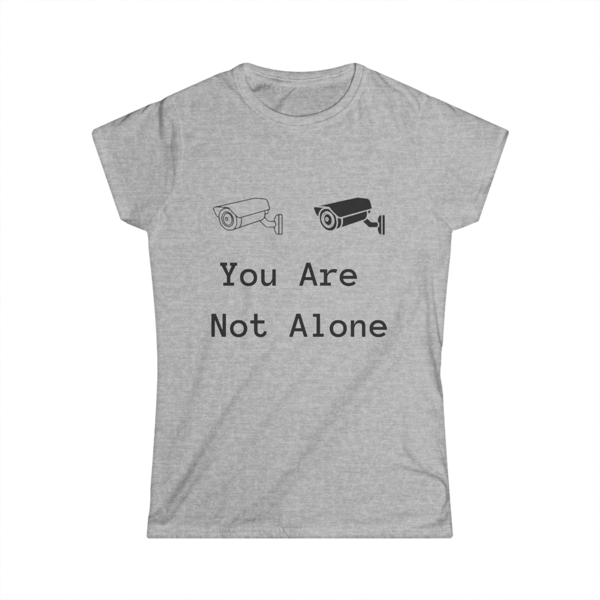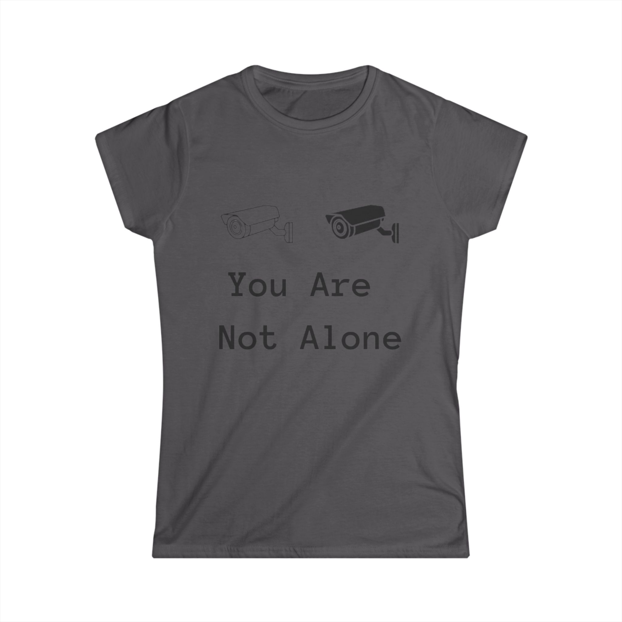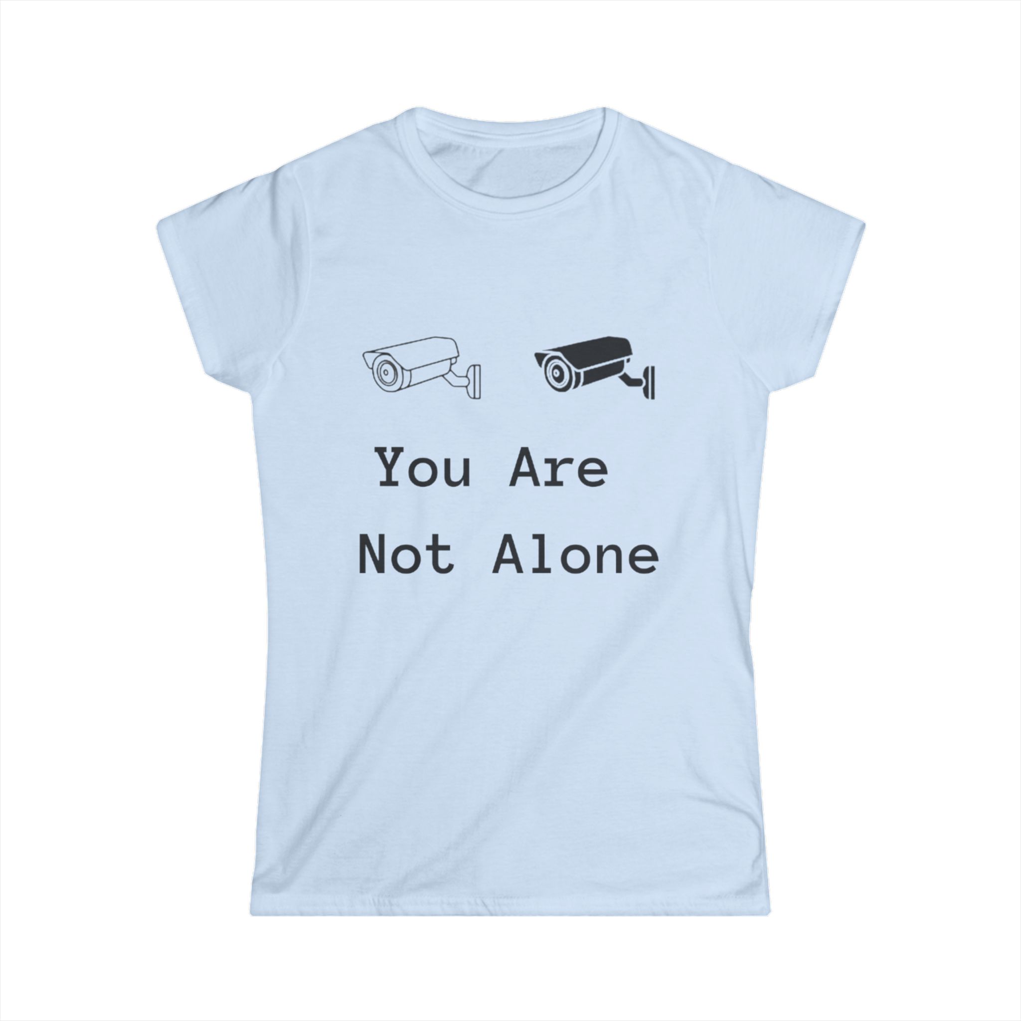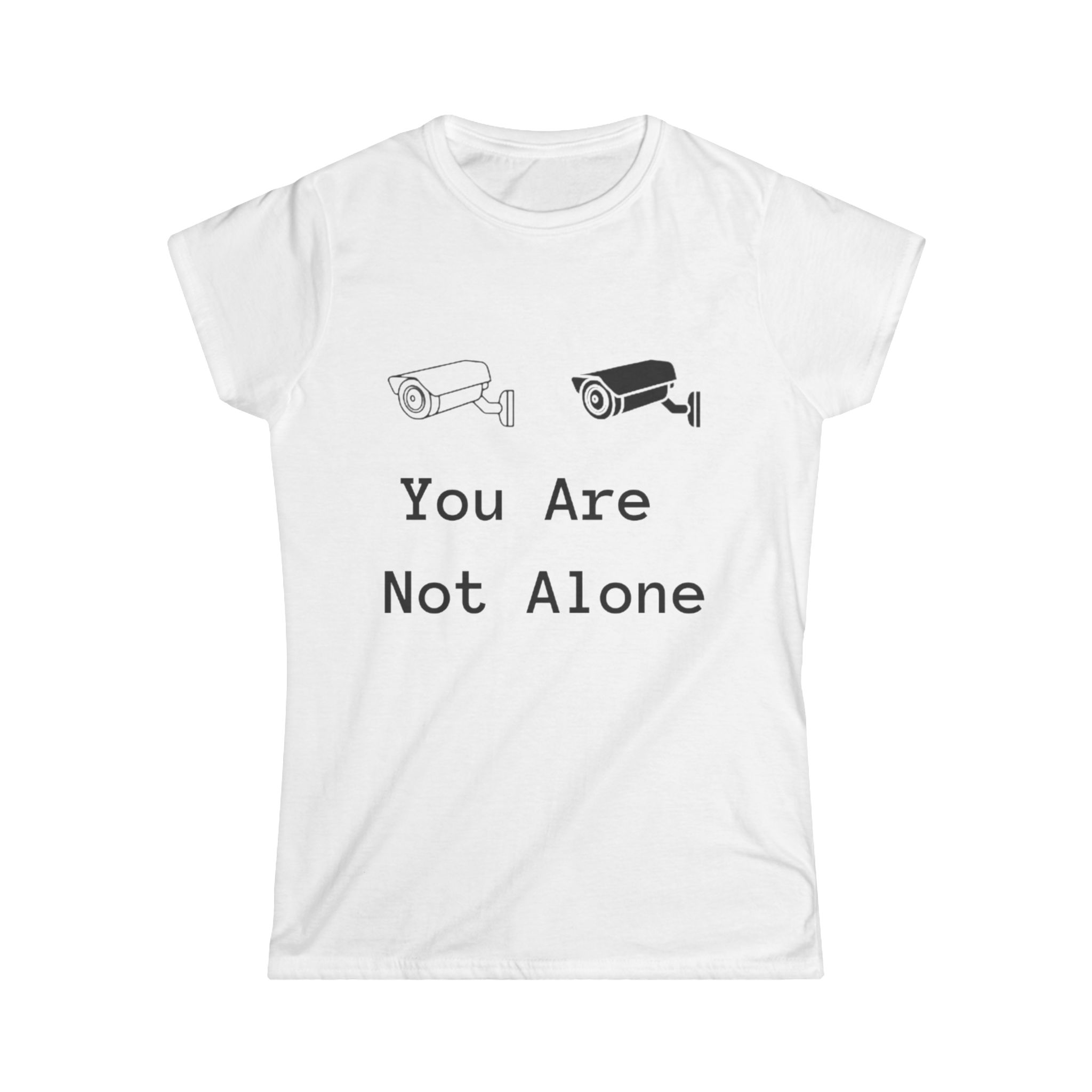 Soft, simple, and quietly defiant — this semi-fitted tee carries a gentle message: You Are Not Alone. The minimalist design pairs two small surveillance-camera icons with understated type, turning a casual shirt into a subtle conversation starter. Lightweight ringspun cotton and a tear-away label keep the feel soft against skin, while the ribbed collar and side seams hold the shape wash after wash. Wear it layered under a denim jacket for city walks, or alone at late-night study sessions — it sits comfortably in everyday life and carries intention without shouting. This tee suits someone who favors low-key statements, values comfort, and likes clothing that nods to modern anxieties with a calm, human touch.